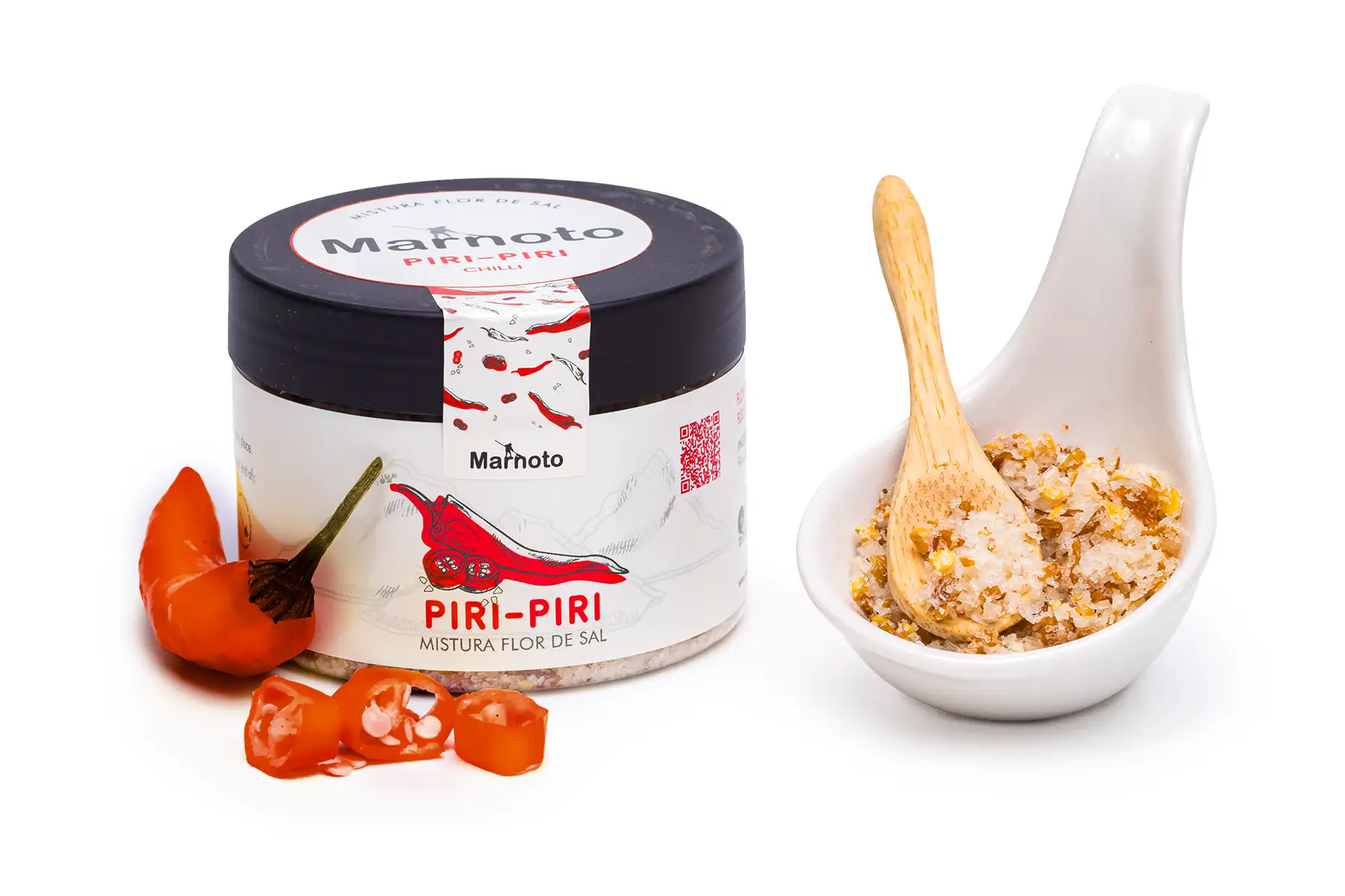 A Flor de Sal Marnoto com Piri-Piri é uma fusão perfeita entre a tradição das salinas artesanais do Algarve e o sabor vibrante do piri-piri algarvio.