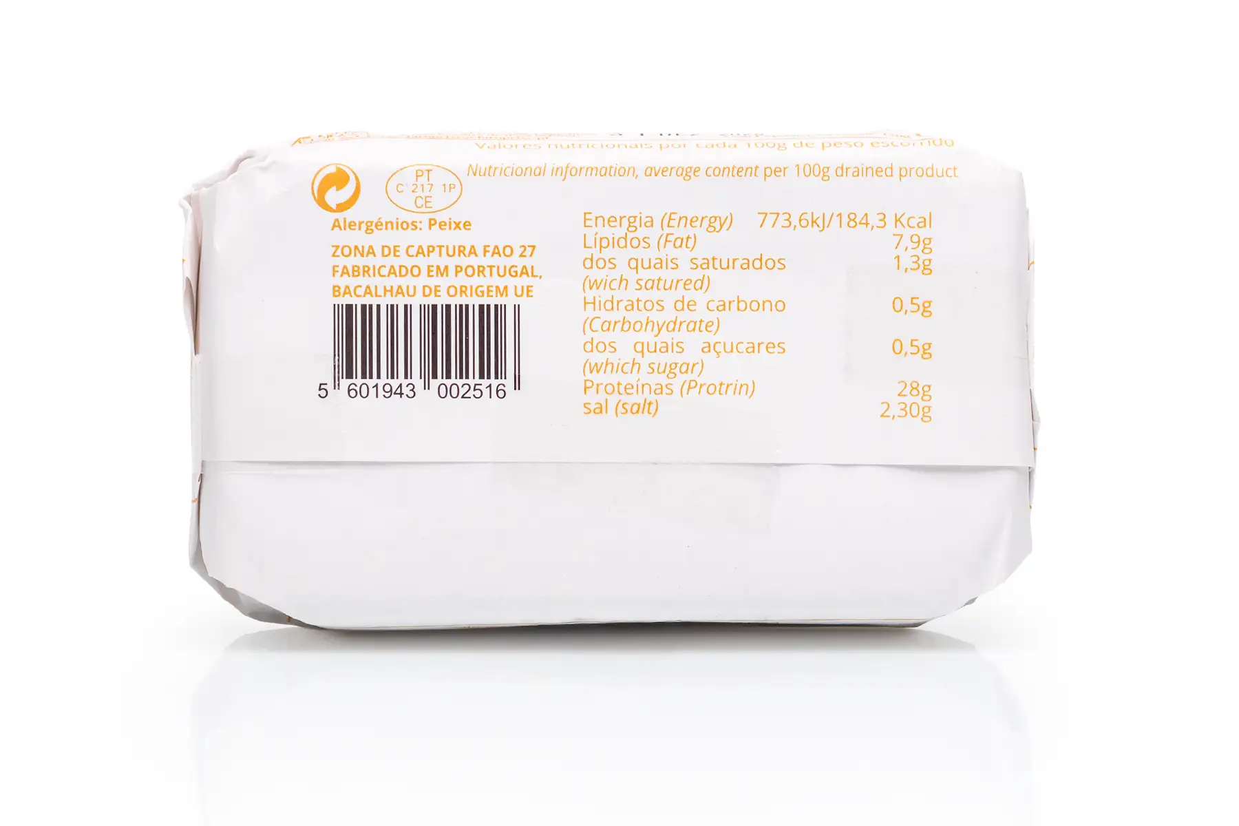 Délicieuse morue conservée dans de l’huile d’olive extra vierge portugaise et de l’ail biologiques, alliant saveur authentique et qualité supérieure.