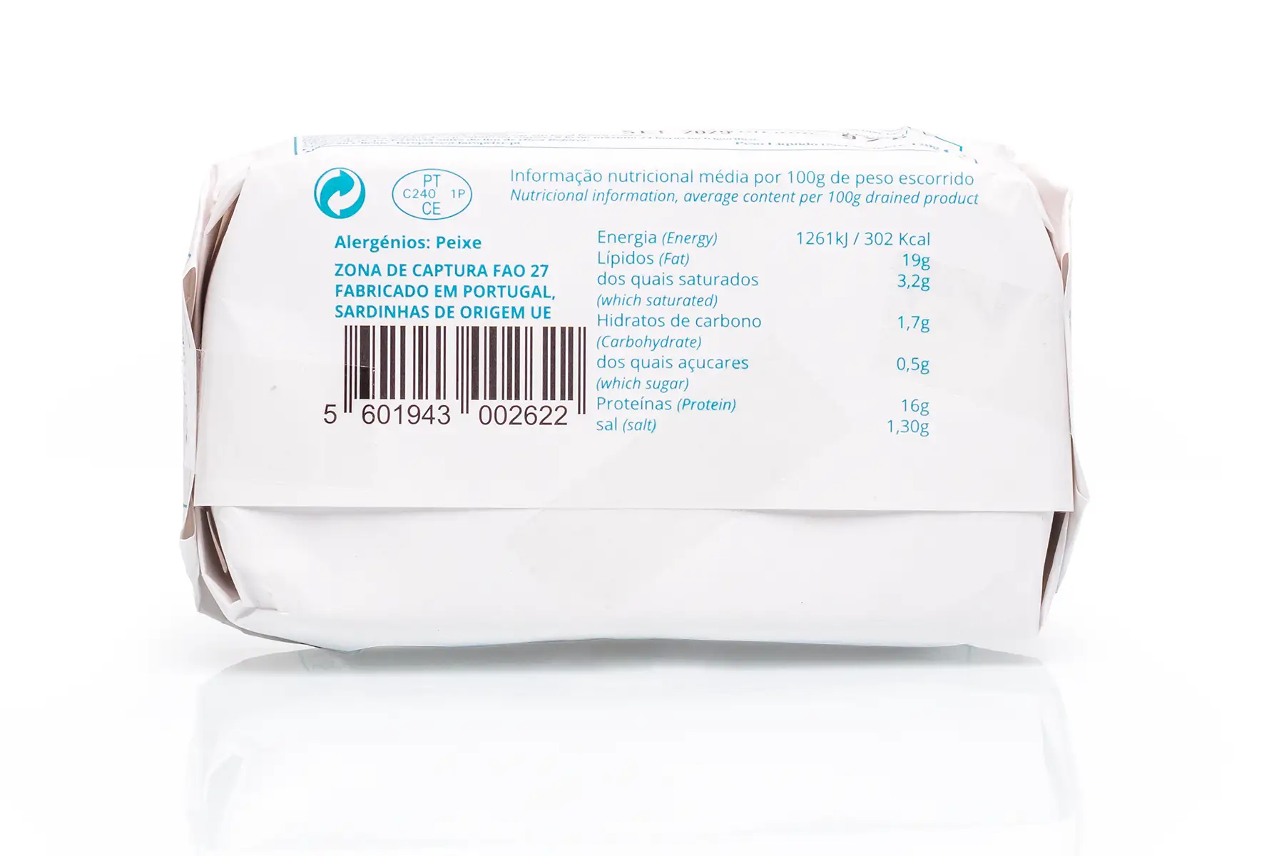 Composição: Sardinhas (70%), azeite virgem extra biológico (27%), alga alface do mar biológica (1%), alga fava do mar (1%) e sal biológico